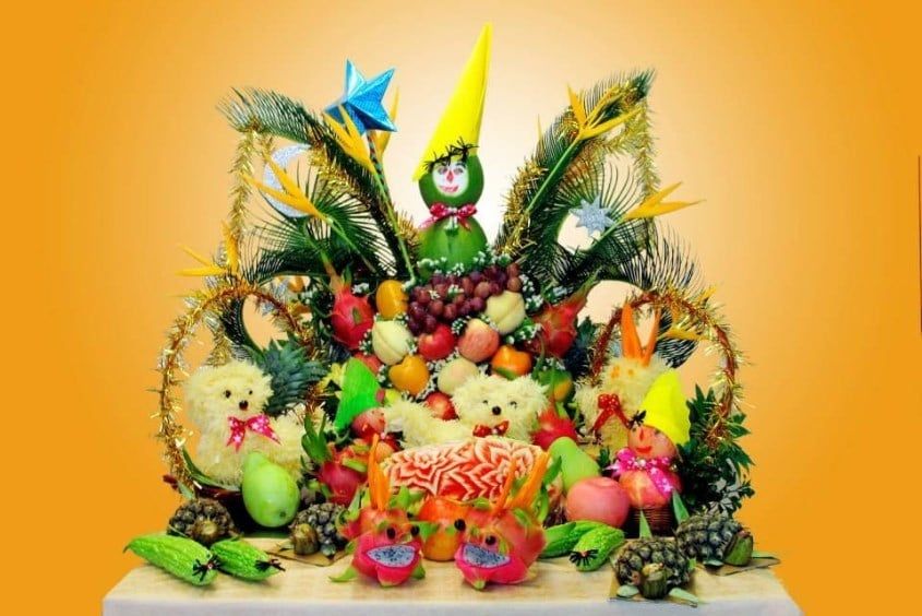 - Kết hợp phụ kiện trang trí: Có thể dùng thêm đèn lồng mini, mô hình cây đa, hoa vải, sticker chủ đề trung thu đặt xung quanh hoặc bên cạnh mâm cỗ.