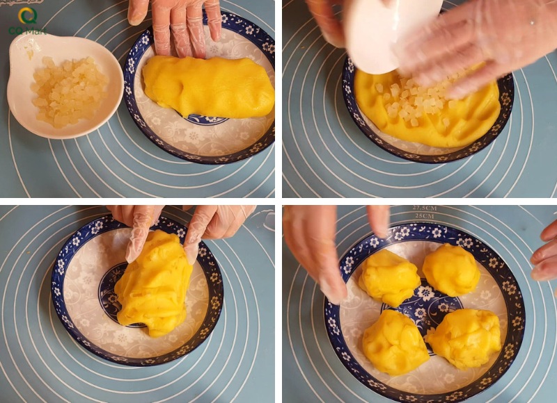 - Chia nhân thành 4 phần có trọng lượng bằng nhau rồi vo tròn từng viên lại cho thật đều.